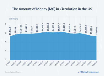 The most recent reports by the Federal Reserve suggest that the M0 supply stream equaled 5,885.2 billion. The amount of money circulating in the US has decreased from a recent peak of 6,413.1 billion in December 2021. This is likely due to the fact that we increasingly rely more on digital assets for transactions.