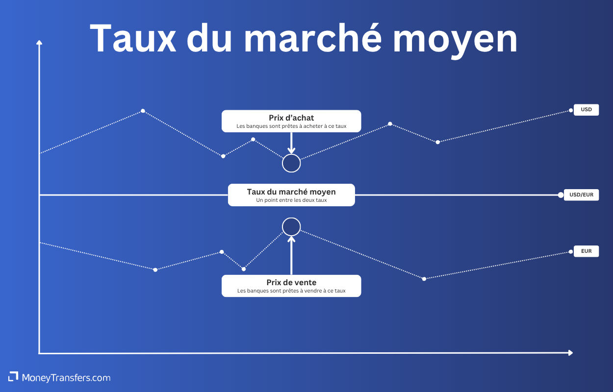 Techniquement, le taux du marché moyen – aussi appelé taux interbancaire ou taux spot – est le point médian auquel les banques échangent des devises entre elles.