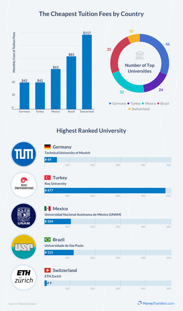Germany boasts no fees for undergraduate degrees and a one-time enrollment fee for postgraduate degrees, which takes the country’s average tuition costs down to an impressive $42 a month. As if this were not enough, when we factor in the quality of the universities, many of which are top ranked, we can truly see what great value a German degree is. While Turkey has the same average tuition fees, its highest ranking university is placed at 477th in the world, so perhaps does not represent quite the same value for money.