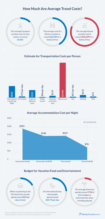 The prices of travel often have the biggest impact on vacation costs. According to the Consumer Expenditure Survey conducted by the US Bureau of Labor Statistics, the average US family spends 33% of their budget for a trip on getting to a destination.
